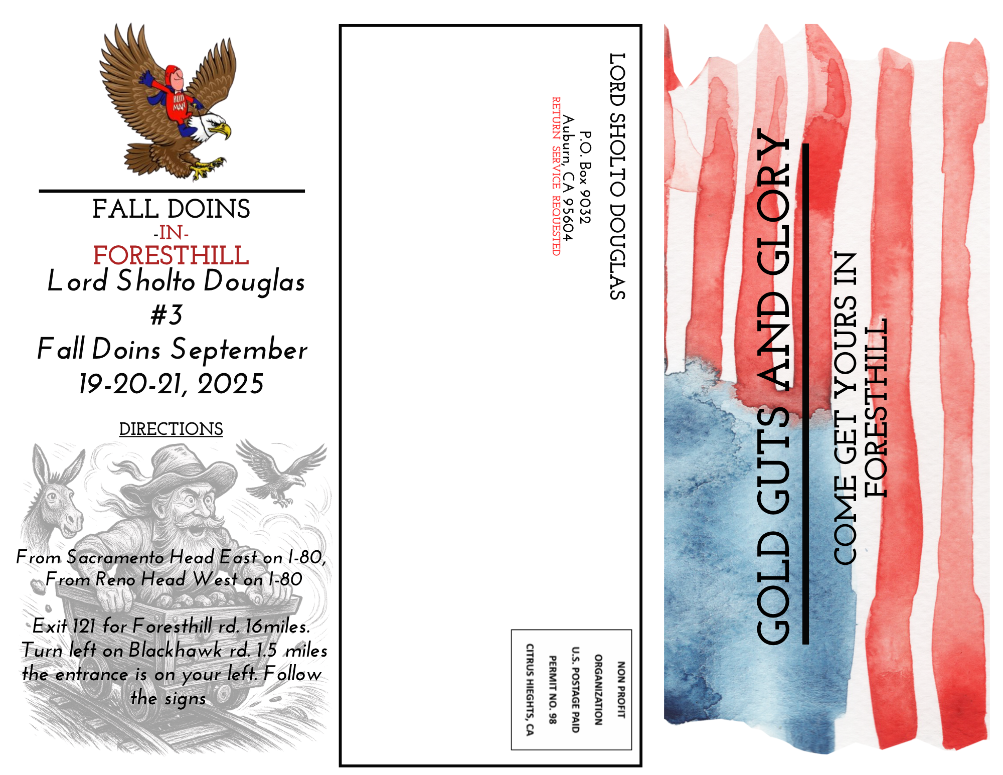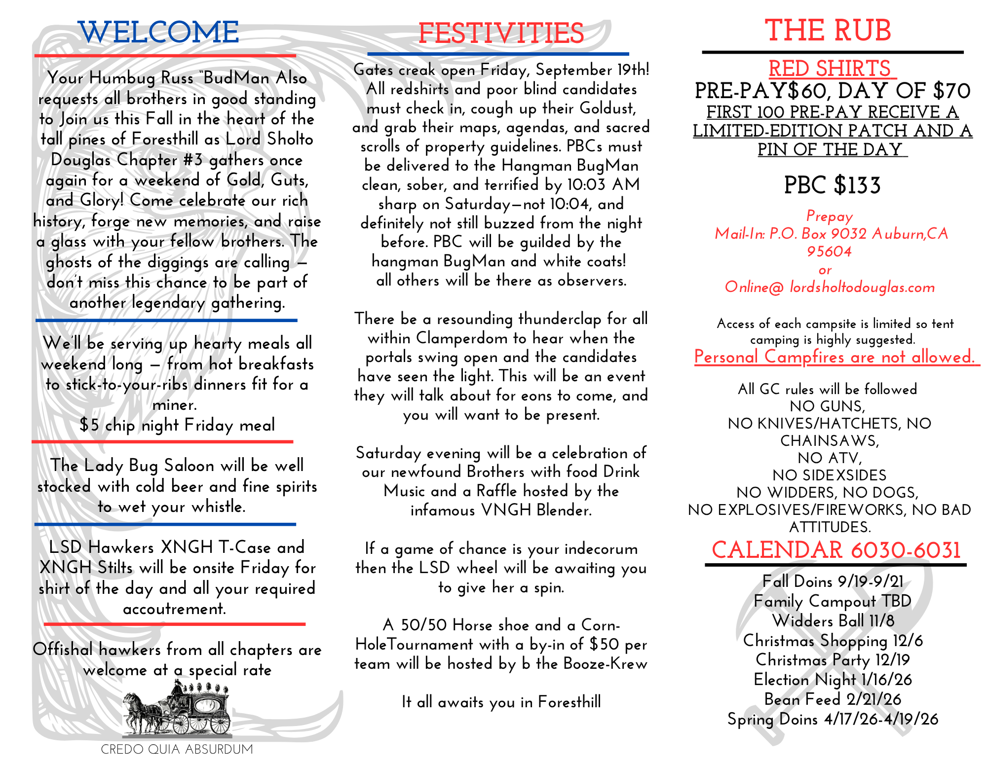 Brothers! Have ye grown weary of the mundane world of logic and sobriety? Do your boots thirst for red dust, your belly for beer, and your heart for legendary nonsense? Then gather your gear, your Goldust, and your finest ridiculous hat—the Fall Doins of Lord Sholto Douglas Chapter #3 is upon us!